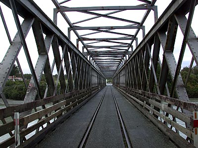 ![]() Diese Brücke teilen sich Autos und Eisenbahn. Außerdem ist sie nur einspurig. |
