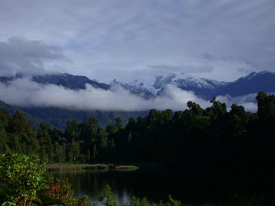 vor uns zum Stehen. Wir fahren weiter Richtung Süden. Jetzt gießt es in Strömen. Erst einige Kilometer vor dem Ort Franz Josef hört es auf zu Regnen und die Sonne kommt heraus. Der Himmel ist plötzlich blau, rechtzeitig vor den Seen Lake Mapourika und Lake Iangi. Der Ort Franz Josef liegt am Fuße des gleichnamigen Gletschers. Zur Gletscherzunge, sowie zu der des Gletschers Fox werden wir uns morgen begeben. Hoffentlich bei besserem Wetter als heute, denn jetzt regnet es schon wieder. |