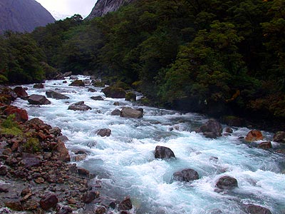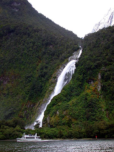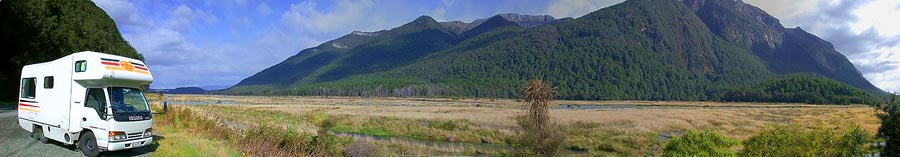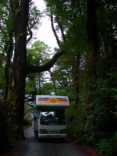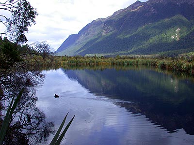 | 10.03.2002 | Die Nacht war stürmisch und regenreich aber morgens begrüßt uns die Sonne. Wir brechen also zum 116 km entfernten Milford Sound auf und werden am späten Nachmittag zurückfahren. Die Strecke führt zuerst entlang des Lake Te Anau und anschließend durch das Tal des Eglinton River zum Lake Gunn. Von dort geht es in Serpentinen hinauf zum Homer Tunnel. Auf der anderen Seite liegt der Milford Sound. Der Milford Sound hat gerade mal 100 sonnige Tage im Jahr und eine jährliche Niederschlagsmenge von 7 Metern! Als wir 1999 hier waren und eine Bootsfahrt unternahmen, hat es nur geregnet. Diesmal hatten wir mehr Glück, einige Wolken und ein wenig Nieselregen, aber zwischendurch ist auch ab und zu die Sonne zu sehen. Ein blauer Himmel würde aber absolut nicht hierher passen ;-) | |||