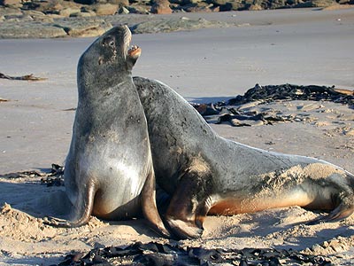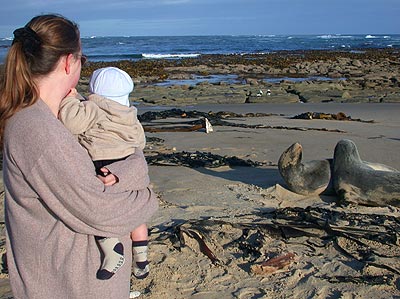 Leider kann ich jetzt nicht mehr soviele Bilder ins Internet stellen. Anschließend gehen wir noch in das Museum von Invercargill. Hier gibt es neben Exponaten zur Geschichte dieser Gegend auch noch ein großes Terrarium und man kann die Tuatara Echsen sehen. Sie gehören zur heimischen Tierwelt und man vermutet, daß sie bis zu 300 Jahre alt werden. Die Art der Tuatara ist auch schon sehr alt und es sind die engsten noch lebenden Verwandte der Dinosaurier. Es ist bereits Nachmittag, als wir zu den Catlins aufbrechen. Die Strecke führt über Gorge Road und Fortrose. Leider hatten wir in Invercargill versäumt zu tanken. Nach einer Karte, in die Tankstellen eingezeichnet sind, sollte es in Fortrose eine geben. Aber die war leider geschlossen - es sah auch nicht so aus, als ob sie jemals wieder geöffnet wird. Also mußten wir 20 km zurückfahren zur nächstgelegenen Tankstelle in Mokotua. Nun war es zum nächsten Campingplatz in Curio Bay kaum noch zu schaffen. Also fuhren wir zum Waipapa Point, einem entlegenen Leuchtturm der nur über eine Schotterpiste zu erreichen ist. Waipapa Point Der Ort erlangte durch ein tragisches Ereignis Berühmtheit. 1881 lief hier das Segelschiff Tararua auf ein Riff und 131 Menschen, darunter Frauen und Kinder, verloren ihr Leben. Daraufhin wurde hier ein Leuchtturm errichtet, um die Schiffe vor dem Riff zu warnen. Hier erlebten wir einen wunderschönen Sonnenuntergang und campierten direkt am Meer. Vorher gab es noch eine erstaunliche Begegnung mit zwei Seelöwen. Tatjana ging mit Joshua auf dem Arm über den Strand und nahm die Seelöwen erst wahr, als einer von ihnen mit der Schwanzflosse wedelte. Da war sie nur noch einen Meter entfernt! So eine Begegnung kann durchaus gefährlich werden. Wenn sich die Seelöwen bedroht fühlen greifen sie an und beißen. Man darf sich auf keinen Fall zwischen Seelöwe und Meer aufhalten. |